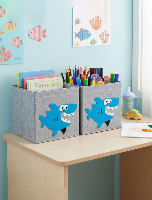 "منظم ملابس أطفال بتصميم سمكة القرش المرح، مثالي لترتيب الملابس، الألعاب، والكتب.